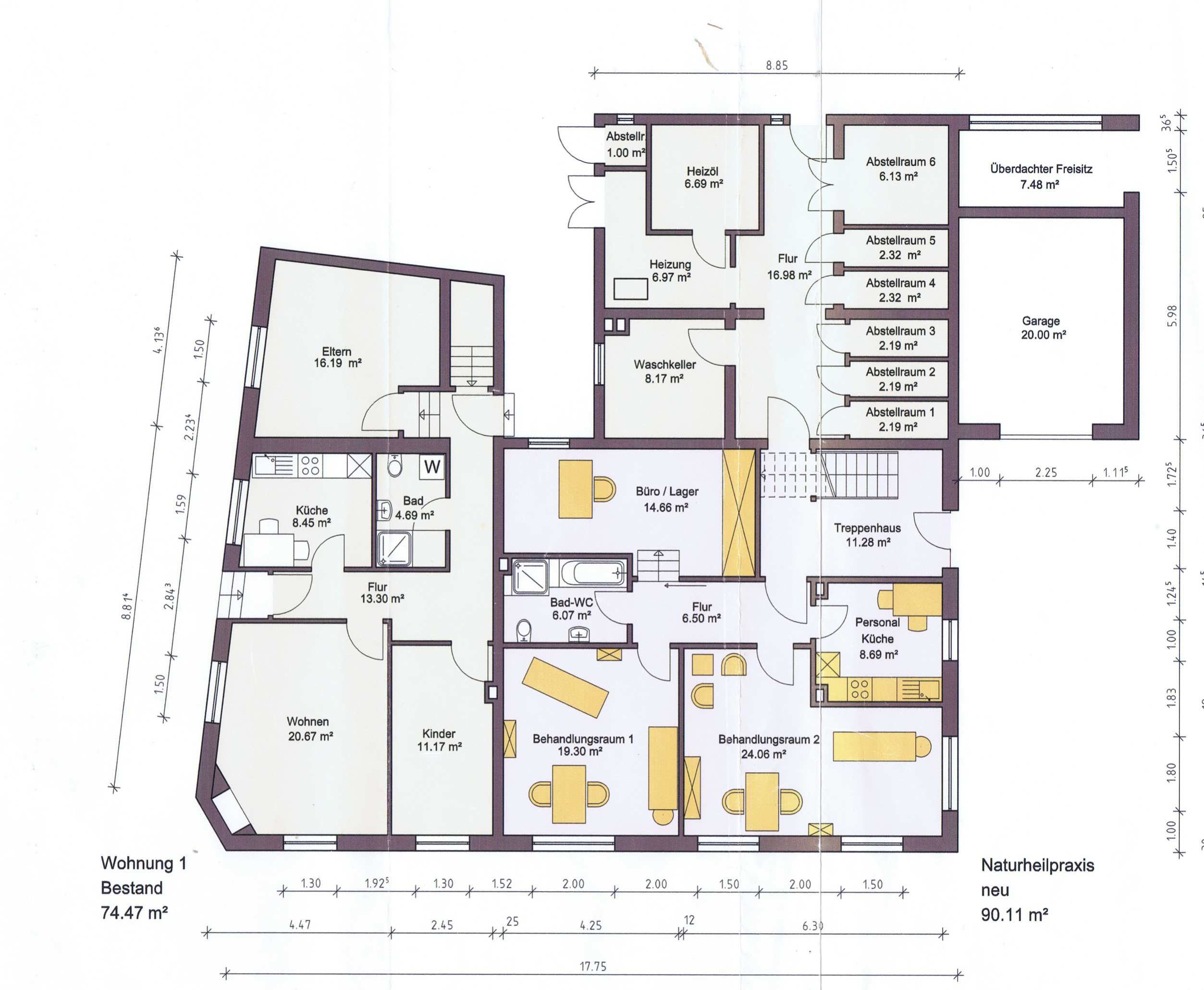 Die aktuelle Aufteilung ist für die Vermietbarkeit sehr gut „klassisch“ und nachgefragt: Im Erdgeschoss befinden sich eine Wohnung mit ca. 75m² sowie eine separate Einheit mit ca. 80m², die ursprünglich als Wohnung genehmigt war, zeitweise als Naturheilpraxis genutzt wurde und aktuell wieder zu Wohnzwecken vermietet ist. Die formelle Nutzungsänderung (Gewerbe zu Wohnen) ist bislang nicht abgeschlossen. Der Eigentümer kann die Situation jedoch sauber finalisieren bzw. die Rückführung in die ursprüngliche Wohnnutzung herbeiführen – für den Käufer ist das eine gestaltbare Ausgangslage je nach Strategie. (ggfs. Gewerbe gewünscht).
