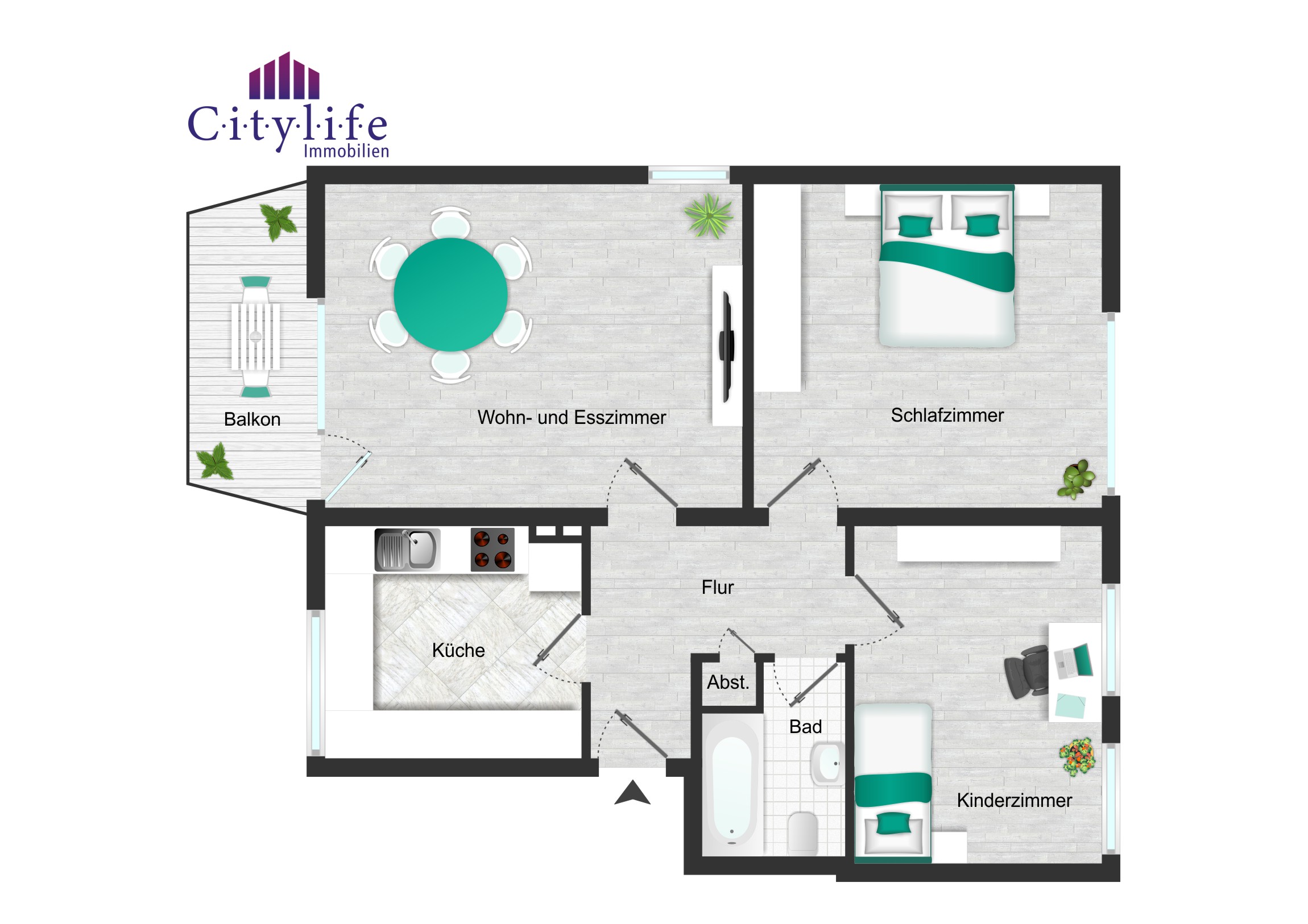 Über den zentralen Flur sind alle Räume gut erreichbar: ein ruhiges Schlafzimmer, ein Kinderzimmer bzw. Homeoffice sowie das Bad. Zusätzlich sorgt ein Abstellraum für wertvollen Stauraum – ein echtes Plus in dieser Wohnungsgröße. Insgesamt wirkt die Aufteilung sehr stimmig: kurze Wege, gut möblierbare Räume und ein überzeugender Außenbezug über den Balkon.